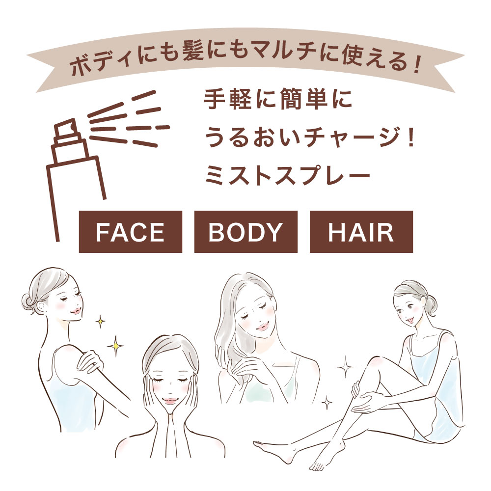 2層式のためご使用前に5回ほど容器を振って混ぜてください。(最後まで、オイルと化粧水の比率が保たれた状態でバランスよく噴霧していただくため) ミストを顔から15~20cmくらい離して大きな円を描くようにして顔全体にかかるようにスプレーします。最後に軽くハンドプレスして馴染ませます。