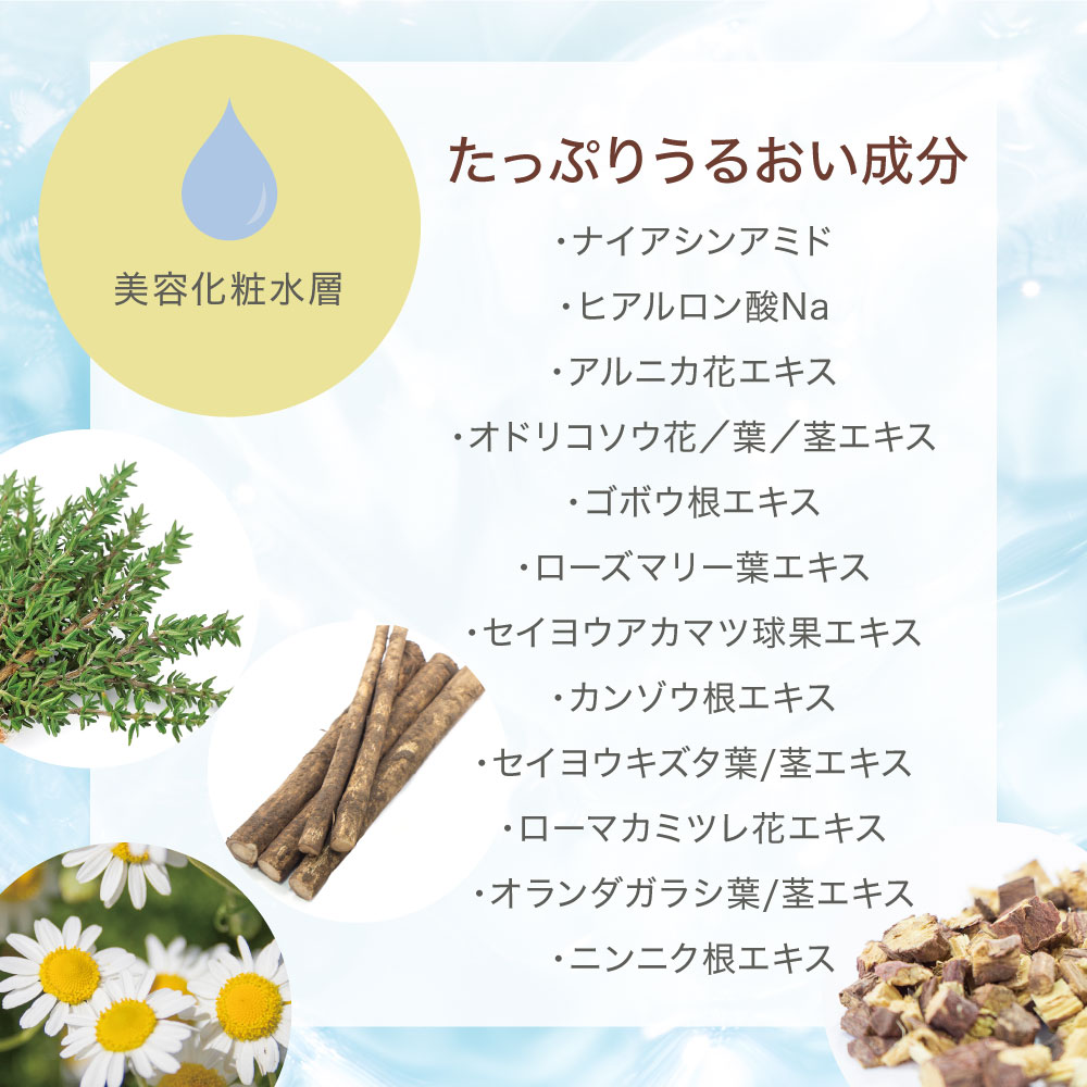 水、ラウリン酸へキシル、トリ (カプリル酸/カプリン酸) グリセリル/ホホバ種子油エステルズ、アルガニアスピノサ核油、オリーブ果実油、アボカド油、ローレル油、アトラスシーダー樹皮油、セイヨウネズ果実油、トコフェロール、ナイアシンアミド、ヒアルロン酸Na、アルニカ花エキス、オドリコソウ花/葉/茎エキス、ゴボウ根エキス、セイヨウアカマツ球果エキス、ローズマリー葉エキス、ローマカミツレ花エキス、オランダガラシ葉/茎エキス、ニンニク根エキス、カンゾウ根工キス、セイヨウキズタ葉/茎エキス、BG、クエン酸Na、クエン酸、フェノキシエタノール、メチルパラベン