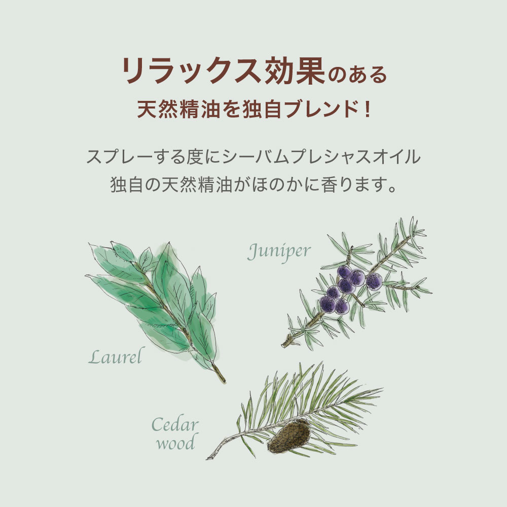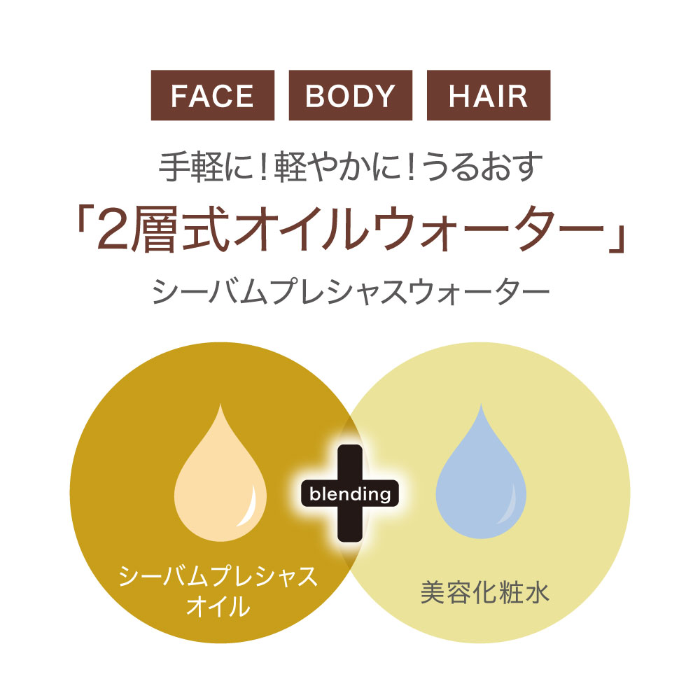 独自製法を採用した植物由来の美容オイル「シーバムプレシャスオイル(既存商品)」を原料に使用したオイル層と、ハリとうるおいを与える美容化粧水層の2層をブレンディングして使用するオイルスプレー。サラッとした軽いつけ心地で、フェイスだけでなくボディやヘアにも、手軽に簡単にうるおいチャージできるミストスプレータイプです。